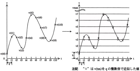 図2左の v(t0), v(t1), …, v(t10) の各測定値を,表1に基づいて符号化すると