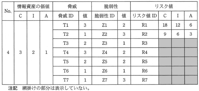 表1 情報資産の洗出し A 情報資産の価値の数値化 表1の各情報資産に対して,C,I,Aのそれぞれについてその価値を評価した値と 評価理由を,表2に示す。