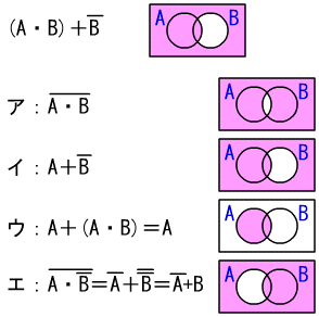 図の論理回路は、上のようになる。また、ア、イ、ウ、エをベン図で表すと 図のようになる。