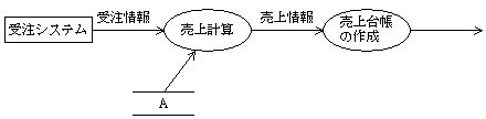 図の DFD からプロセス(売上計算)は、受注システムからデータ(受注情報)を受け取り、 ファイル A から情報を受け取り、売上情報を作成して、プロセス(売上台帳の作成)に渡す。