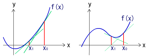問05 ニュートン法に関する記述方程式 f ( x ) = 0 の解の近似値を求めるアルゴリズムとして 知られているニュートン法に関する記述として,適切なものはどれか。 イ 幾何学的には, y = f ( x ) の接線を利用して解の近似値を求めるものである。 ウ 異なる初期値を二つ与える必要がある。 エ どのような初期値を与えても,必ず解の近似値が得られる。 解説