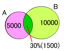 問30 検索システム検索システムにおいて,最初に A という条件で検索したところ,検索結果は 5,000 件であった。 更に B という条件で絞り込むと,その 30 %が残った。 最初に B という条件で検索した検索結果が 10,000 件である場合, 更に A という条件で絞り込むと何%が残ることになるか。 解説