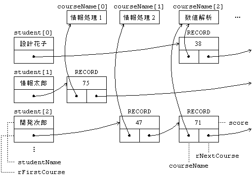 図2 読込みファイル群の例 (3) プログラムは,はじめに関数 init を呼ぶことで,図2に示した3種類のファイルから 図3に示すようなリスト構造をメモリ上に構成する。 科目キー courseKey の科目名は,char 型の配列 courseName[courseKey] に格納される。 また,学生キー studentKey の学生情報は STUDENT 型の構造体 student[studentKey] で表現され,メンバ studentName には学生氏名が,メンバ rFirstCourse にはその学生 成績情報を表すリストの先頭へのポインタが格納される。 学生の各履修科目についての成績情報は RECORD 型の構造体で表現し,メンバ score には得点, メンバ courseName には科目名へのポインタ,メンバ rNextCourse には他の履修科目の 成績情報へのポインタが格納される。