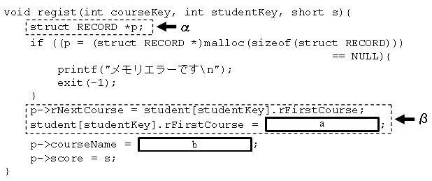 図3 データ構造例 (4) プログラム中で定義されているその他の関数の説明は次のとおりである。 void regist(int courseKey, int studentKey, short s);