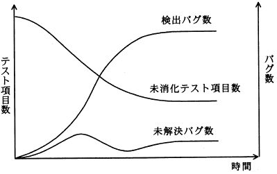 問47 プログラムテストの管理図プログラムテストの管理図において,図のようにすべての線が横ばい状態になった。 この状況から推測できることとして,適切なものはどれか。