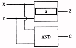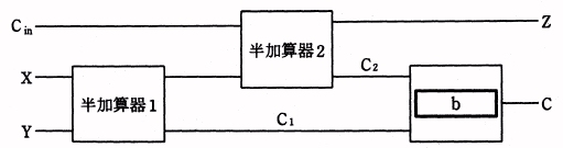 全加算器は,図2に示すように半加算器を2段に接続して実現する。半加算器1はXとYを加算し, 半加算器2は半加算器1の結果と Cin を加算する。このとき, 半加算器1のけた上がりを C1,半加算器2のけた上がりを C2 とする。 X,Y, Cin と, C1, C2 との関係は表3のとおりになる。