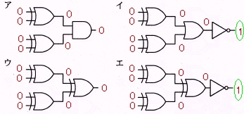 4ビットの入力データに対し,1の入力数が0個又は偶数個のとき出力が1に, 奇数個のとき出力が0になる回路はどれか。