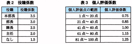 (2) 賞与 @ 賞与は,次の式で計算する。 賞与=基本給×(役職係数+個人評価係数) A 役職係数は,表2に示すとおりである。 B 個人評価係数は,表3に示すとおり個人評価点の範囲によって決まる。