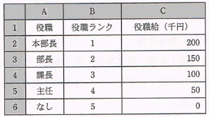 図1 ワークシート“役職給” 役職をセル A2 〜 A6 に,役職の序列を示す数値である役職ランクをセル B2 〜 B6 に, 役職給をセル C2 〜 C6 に入力する。 〔ワークシート:賞与係数〕 賞与の計算の基となる役職ごとの役職係数及び個人評価点に対応した個人評価係数を 登録した図2のワークシート“賞与係数”を作成した。