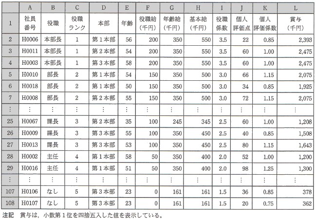 A 年齢給を求める計算式 B 基本給を求める計算式をセル H2 〜 H108 に入力する。 (3) 賞与を求めるための計算式を入力する。 @ 役職係数を求める計算式をセル I2 〜 I108 に入力する。 A 個人評価点をセル J2 〜 J108 に入力する。