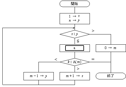 問06 2分探索法昇順に整列済の配列要素A(1),A(2),…,A( n ) から, A( m ) = k となる配列要素A( m ) の添字 m を 2分探索法によって見つける処理を図に示す。 終了時点で m = 0 の場合は,A( m ) = k となる要素は存在しない。 図中の a に入る式はどれか。 ここで,“/”は,小数点以下を切り捨てる除算を表す。 ![]() ウ ( x − y ) /2 → m エ ( y − x ) /2 → m