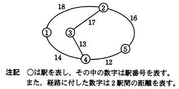 問08 必須問題次のプログラムの説明及びプログラムを読んで,設問に答えよ。 鉄道の路線がある,駅数 N は2以上で,各駅には駅番号( 1,2,…,N )が付いている。 どの任意の2駅間にも,それらを結ぶ経路が一つ以上存在する。また, 隣接する2駅間を直接結ぶ経路は一つだけ存在し,その距離が与えられている。 図1に5駅からなる鉄道の路線例を示す。