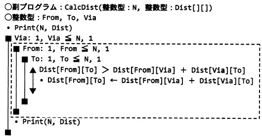![]() 図1 鉄道の路線例 (1) 〔プログラムの説明〕 副プログラム CalcDist は,駅数 N 及び要素数 N×N の2次元配列 Dist を受け取り, プログラムに示すアルゴリズム(Warshall-Floyd 法)によって,配列 Dist の内容を 更新しながら各駅間の最短距離を求めていく。実行が終わると,任意の2駅 i,j 間の 最短距離が Dist[i][j] に求められている。どの2駅間についても, その最短距離は 999 より小さいものとする。配列 Dist の添字は1から始まる。 副プログラム CalcDist に渡す配列 Dist には,次の値を格納する。 なお,図1の路線情報を格納した配列 Dist の内容を,図2の初期値に示してある。 (1) 2駅 i,j が隣接しているとき,Dist[i][j] 及び Dist[j][i] には, その駅間距離を格納する。例えば,図1の駅@とAは隣接しているので, Dist[1][2] 及び Dist[2][1] には,18を格納する。 (2) 2駅 i,j が隣接していないとき,Dist[i][j] 及び Dist[j][i] には,未確定を 表す距離 999 を格納する。例えば,図1の駅@とBは隣接していないので, Dist[1][3] 及び Dist[3][1] には,999 を格納する。 (3) 各駅iについて,Dist[i][1] には0を格納する。 副プログラム CalcDist 中の Print(N,Dist) は,配列 Dist のその時点の内容を 印字する副プログラムである。 〔プログラム〕