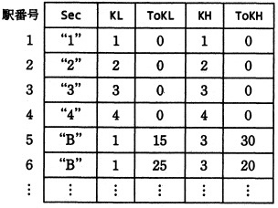 ![]() 図3 鉄道の路線例 (2) 図4 鉄道の路線例 (2) の基幹駅区間名 各駅間の最短距離は,次の方法で求める。 (1) 中間駅を全て除いて,基幹駅だけからなる路線を考え,二つの基幹駅を結ぶ 経路ごとに一意の区間名を付ける。図3の路線例にこの操作を加えたものが図4である。 例えば,図3の経路@−D−E−Bは,図4の区間Bに対応する。 (2) 要素数 K×K の2次元配列 Dist を用意し,事前に配列 Dist 各基幹駅間の 最短距離を求めておく。 (3) 全ての駅について,表1に示す形式の駅情報表を用意する(表1には, 図3の駅情報の一部が示してある)。 中間駅の場合,Sec はその駅が属する区間の区間名,KL,KH はその駅が属する区間の 両端の駅番号( KL ≦ KH とする),ToKL,ToKH はその駅から駅 KL,KH までの距離である。 基幹駅の場合,その駅は自分自身の駅を両端とする距離0の区間に属すると考えて, 表1の例のように中間駅と同様の情報を用意する。 これらの情報は,駅番号を添字として参照する。 例えば,駅番号 5 の ToKL の値は ToKL[5] として参照する。