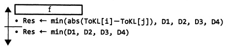 ・D2 ← ToKL[i] + Dist[KL[i]][KH[j]] + ToKH[j] ・D3 ← ToKH[i] + Dist[KH[i]][KL[j]] + ToKL[j] ・D4 ← ToKH[i] + Dist[KH[i]][KH[j]] + ToKH[j]