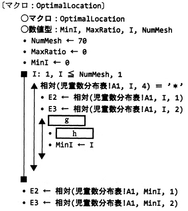 設問3 小学校の新設に適している場所の座標を探索することを考える。 メッシュを探索するためのマクロ OptimalLocation をワークシート“小学校配置”に 格納した。マクロ OptimalLocaticn を実行すると,新設小学校の座標が 入るセル E2 及び E3 の値を,S市を構成する各メッシュの中心点の座標で 順次変化させていく。最終的に,全ての小学校が制約条件を満たし,かつ, 各小学校の充足率のうちの最小値が最も大きくなる座標を,新設小学校の座標として表示する。 マクロ OptimalLocation の に入れる正しい答えを,