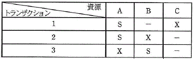 表は,トランザクション1〜3が資源 A 〜 C にかけるロックの種別を表す。 また,資源へのロックはトランザクションの開始と同時にかけられる。 トランザクション1〜3のうち二つのトランザクションをほぼ同時に開始した場合の動きについて, 適切な記述はどれか。 ここで,表中の“−”はロックなし,“S”は共有ロック,“X”は専有ロックを示す。