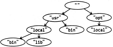 問11 Java問11 次の Java プログラムの説明及びプログラムを読んで,設問1〜3に答えよ。 〔プログラムの説明〕 ディレクトリパス(以下,パスという)から木構造を生成するプログラムである。 パスは,木構造をもつファイルシステムにおいてディレクトリを特定するために 利用される文字列であり,ディレクトリの名前を“/”で区切って並べて表す。 “/”で始まるパスを絶対パスという。絶対パスはルートディレクトリを 起点として表したパスである。“/”で始まらないパスを相対パスという。 相対パスは任意のノードを起点として表したパスである。 このプログラムが生成する木構造中の各ノードは,それぞれが一つのディレクトリを 表し,ルートノードはルートディレクトリを表す。 図1に木構造の例を示す。図1中の楕(だ)円一つはノード一つに対応し, “ と ” で囲まれた文字列はノードの名前を表す。ルートノードの名前は空文字列とする。 例えば,ノード usr を特定する絶対パスは“/usr”であり,ノード usr を起点とする 相対パス“local/lib” が特定するノードは,絶対パス“/usr/local/lib”が 特定するノードと同じノード lib である。