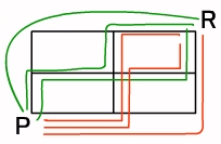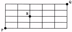 図の線上を,点 P から点 R を通って,点 Q に至る最短経路は何通りあるか。