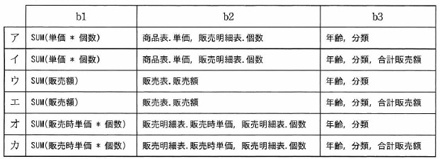 FROM (SELECT 2Ø17 - 会員表.生年 AS 年齢, 商品表分類, b2 FROM 会員表, 販売表, 販売明細表, 商品表 WHERE 会員表.会員番号 = 販売表.会員番号 AND 販売表.伝票番号 = 販売明細表.伝票番号 AND 販売明細表.商品番号 = 商品表.商品番号 AND 販売表.販売日 >= '2Ø17-Ø1-Ø1' AND 販売表.販売日 <= '2Ø17-Ø6-3Ø' ) FACTTB GROUP BY b3 ORDER BY 年齢 ASC, 合計販売額 DESC b に関する解答群 ![]()