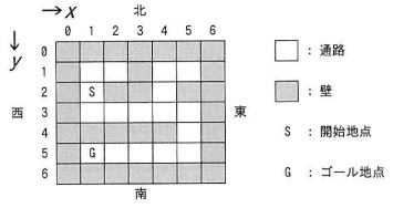 開始地点でない通路のうちの一つがゴール地点である。本問で扱う迷路を,図1に示す。